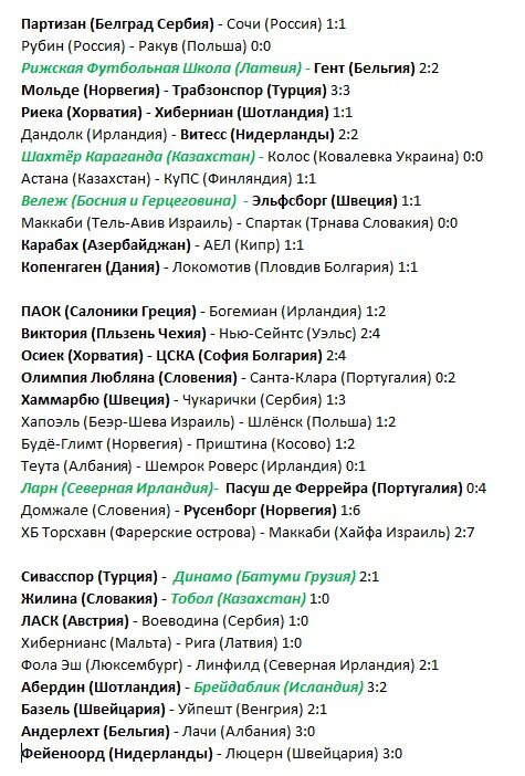 Ответные матчи 3-го раунда распределил на три группы: кто сыграл вничью свой первый матч на выезде, кто проиграл на выезде и кто выиграл свой выездной матч. В это группе матчей и наши "Сочи" и "Рубин" (Казань). Сочинцы сыграли дома 1:1 с белградским "Партизаном", а казанцы сыграли 0:0 в Польше с местным клубом "Ракув". Снова удивила команда Рижская Футбольная Школа, успешно сыграв в Бельгии. Хорошо играют ребята, да и название какое. Хочется пожелать им победы. Также интересно будет узнать как сыграют команды из Казахстана, в этом году они особенно здорово играют. Ну и понаблюдаем за "Локомотивом" и "Спартаком", такие названия носят команды из Болгарии и Словакии. Хозяевам надо отыгрываться, ожидают