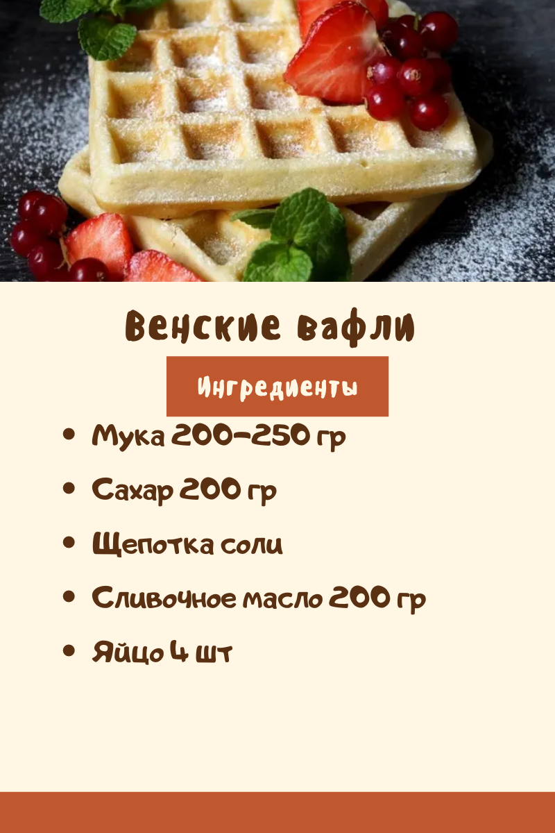 Здравствуйте, дорогие друзья! Наверняка все пробовали покупные венские вафли и помнят их нежный вкус. Хочу поделиться с вами рецептом этих вафель. Нам понадобится мультипекарь и ваше желание Итак, берем 4 яйца, 200 гр сахара и щепотку соли. Помещаем все это в ёмкость и взбиваем После того,как наши ингредиенты хорошенечко перемешались, добавляем сливочное масло (предварительно масло нужно растопить и немного остудить). Все это взбиваем в помощью блендера или венчика Добавляем муку. Вносим ее порциями и все смешиваем На самом деле рецепт этот очень простой, а приготовление вафель занимает 20-30 минут В предварительно разогретый мультипекать вносим нашу массу Вафли получаются нежные и воздушные Приятного аппетита!!!