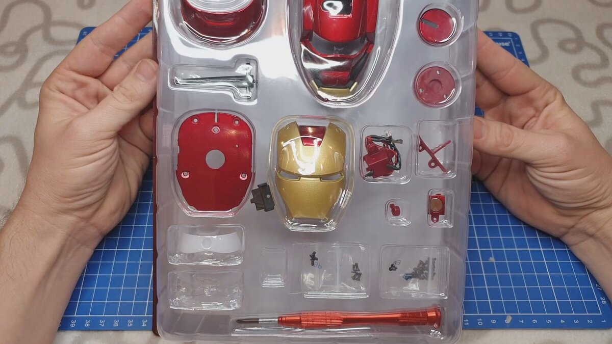 Однажды зимним, холодным вечером жена принесла вместе с продуктами сборную модель. Я сначала не придал сильно значения, но потом как увидел что это шлем железного человека меня чуть не порвало от радости. Естественно отложив свои дела я уселся за сборку. Все внешние детали из металла и круто покрашены. Спустя много минут любования деталями, я все таки приступил к сборке