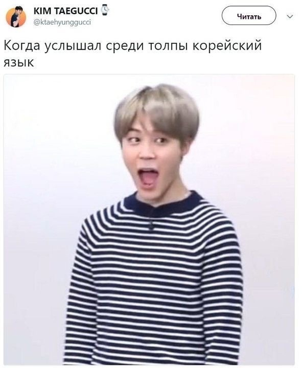 Очередная подборка шуточек Арми) Наслаждайтесь! Хоть я и живу в Москве, увидеть корейцев - вообще чудо, а услышать корейский в нашем-то шуме - за гранью фантастики. Но Арми всемогущи) А из какого вы города? Если там много корейцев, то я перееду... Был случай на трансляции, когда фанатка написала "вы взволнованы перед встречей?",а переводчик перевел ребятам как "вы ВОЗБУЖДЕНЫ перед встречей?" аахахах Ой, жиза в глаз попала Признавайтесь, кто его так называет? Ну хоть фотографии видим, ну хоть что-то Все профессора так себя ведут Абсолютно согласна Можно я тоже подружу с ним...... И НЕ ГОВОРИТЕ МНЕ, ЧТО НЕПОХОЖЕ Теперь захотелось этих печенек... Минутка мотивации (как думаете, стоит ли написать про это статью?) Всех хейтеров Чимина ждет порча на понос Следующая часть уже в пути, хорошего дня, мои дорогие! Еще подборки мемов: