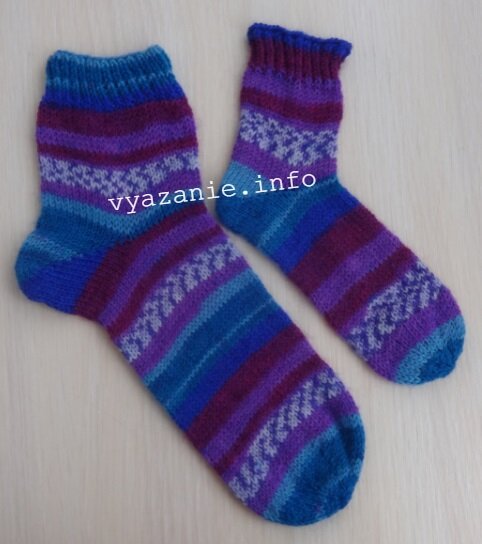 Как и обещала в предыдущей статье, показываю носки, связанные из пряжи ALIZE Superwash спицами №2. Сразу скажу, что носки получились плотные, хорошо тянутся, после стирки распушились. Мне очень понравились. Рисунок отлично сформировался на взрослых носках. Пряжа ALIZE Superwash 100 г = 420 м, 75% шерсть, 25% полиамид. Спицы носочные №2. Связала снова 2 пары носков из одного мотка пряжи: взрослые 39 размер и детские 15 размер. Израсходовала почти 80 г. Ещё на малюсенькие носочки должно хватить. Носки на 39 размер ноги для молодой женщины. Начинала вязание, вытянув нить изнутри мотка, с голубого цвета. Обрезала нить ровно до того места, где начинался голубой цвет. Описание. Как вязать носки Набираем самым обычным способом на спицы 56 петель +1 для смыкания в круг. На каждой спице по 14 петель. Вяжем резинкой *1 лицевая скрещенная, 1 изнаночная скрещенная* 3 см. Дальше лицевой гладью до пятки. Пятку бумеранг я вязала на половине петель. Видео МК в этой статье. В середине 8 петель. Снова