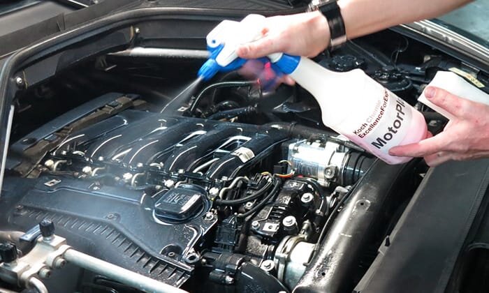 Если вы хотите сделать это сами, то вот вам инструкция! ⠀ Движок нужно подготовить. ⠀ 1. Дайте ему полностью остыть, так как попадание воды на головки или головки блока цилиндров может привести к их деформации 2. Снимите клеммы с АКБ 3. Полиэтиленом накройте генератор, катушки зажигания, клеммы, воздухозаборник, и труднодоступные места, откуда тяжело будет удалять влагу (используйте для фиксации скотч) 4. Подготовьте раствор в соотношении 50 мл «химии» на 1 литр воды Как правильно мыть мотор ⠀ Брать ведро и лить на движок не нужно. Вооружитесь терпением. Лучше взять пульверизатор и не спеша нанести раствор на поверхность мотора. Потом берёте влажную губку и нежно протираете загрязнённые места. Это нужно, чтобы размочить засохшую грязь. Для въевшейся грязи используйте раствор воды и керосина. Ни в коем случае не протирайте этим раствором пластик и окрашенные компоненты. После обработки сделайте перерыв, чтобы всё отмокло, но недолго: раствор не должен засохнуть! ⠀ Теперь нужно всё опол