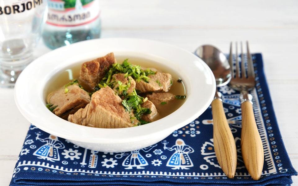 Грузинская хашлама готовится без добавления овощей – только мясо и специи. В бульон для аромата кладется целая очищенная луковица, горошки черного перца, лавровый лист, чеснок, соль. Подается хашлама со свежей зеленью. Такую хашламу, например, я видела на поминальном столе у грузинских армян из Ахалкалаки.