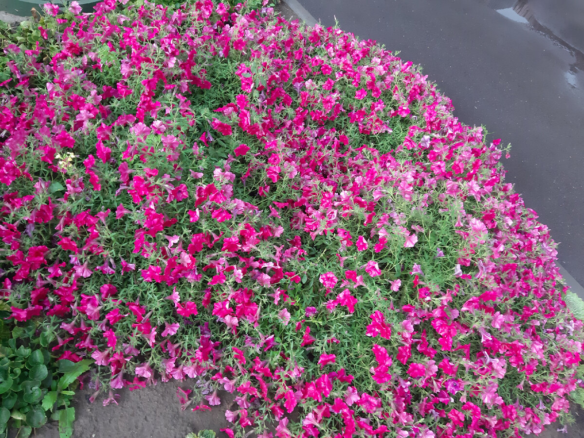 Из всех моих цветов самые капризные к дождю и теряющие вид - это ампельные петунии. Когда первый раз сажала ампельные петунии - почти верила, что до первого дождя... уж очень много пишут про то, что дождь им вреден, что боятся они попадания воды внутрь цветка. Однако, это миф. Второй день дождь - вот они: Это просто сильный дождь. А в прошлом году в августе были бури, которые вообще переворачивали вверх ногами весь цветочный ковер. Приходилось укладывать его обратно - а это примерно 4 кв метра цветочной площади! Те, кто сажают впервые или только планируют ампельные петунии - не паникуйте😊 все будет хорошо. Пару дней после окончания дождя мокрые петунии будут выглядеть не парадно, а потом сами восстановятся. Не надо им обрывать якобы увядшие цветы! Очень важно не трогать цветы совсем! Они сами отлично восстановятся. Второй капризный цветок - калибрахоа. Даже в оранжерее, когда брала рассаду - предупредили - убирай от дождя и ветра. Поэтому живет в кашпо. И прекрасно живет - во вре