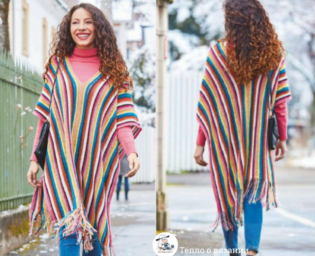Пончо хороши тем, что вяжутся просто, а выглядят часто весьма необычно и стильно. А поскольку я отношусь к людям, предпочитающим классическую простоту, не могу пройти мимо описаний, как связать пончо или накидку. Один из вариантов я собиралась связать как раз к этому лету, даже купила полкило ярко-синей полушерсти. Но воз и ныне там. А нереализованная мечта сотворить наконец вожделенный предмет гардероба толкает меня на изучение всё новых вариантов. Добрый день, дорогая читательница! Вы на канале о вязании. Меня зовут Татьяна Кетрарь и сегодня я буду вслух мечтать об очередных моделях накидки для лета/ранней осени. Первой будет вот эта полосатая вещица. Не удивляйтесь, что я обратила на неё внимание. Ведь мы творческие люди, и часто достаточно лишь идеи, чтобы воплотить её в то, что на источник совсем не похоже. Длинное пончо в полоску Как выглядит Лёгкая, не сковывающая движений, форма, универсальность в носке (иначе говоря, надеть можно по любому случаю), простор для фантазии при об