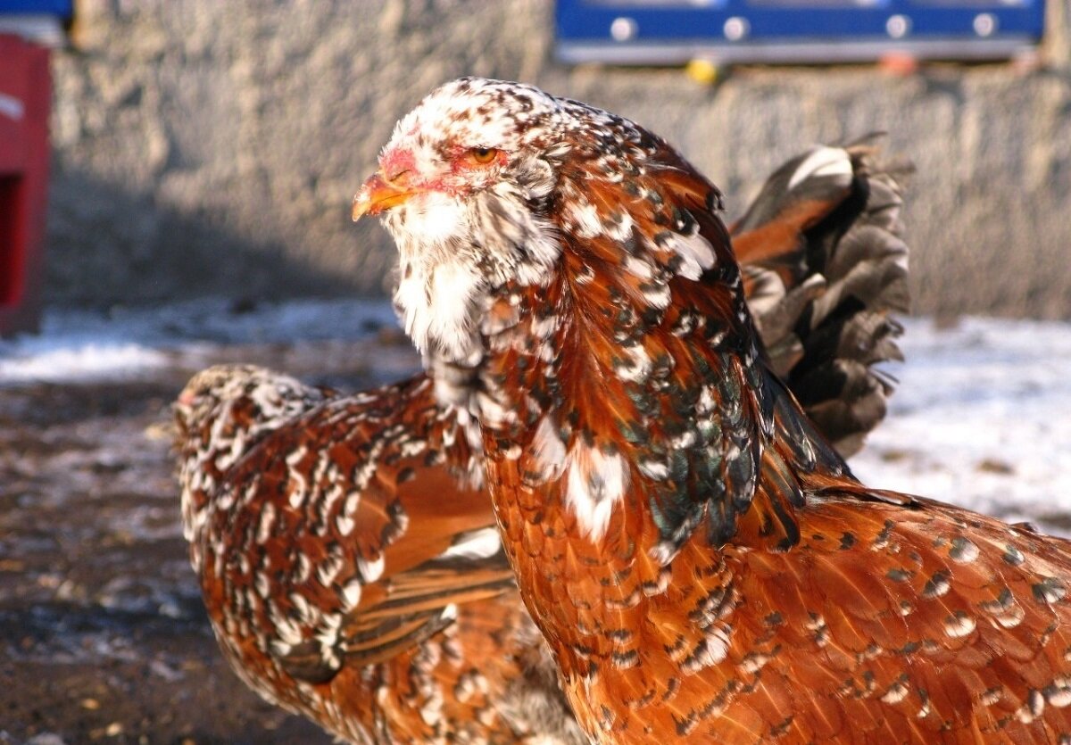 Куры имеют идентичный окрас, но расцветка не такая яркая, как у петухов. На бородке и загривке достаточно много белых перьев. Светлые вкрапления на корпусе четко очерчены.