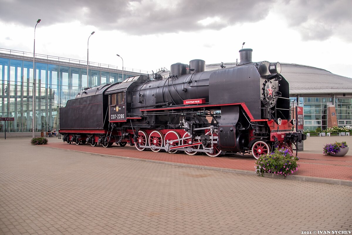 1. Самый первый паровоз в музее можно увидеть даже не входя в музей. Точнее перед зданием музея, которое раньше было зданием депо. Посетителей встречает большой черный паровоз серии СО17 с номером 2286, который установлен чуть в стороне от входа.