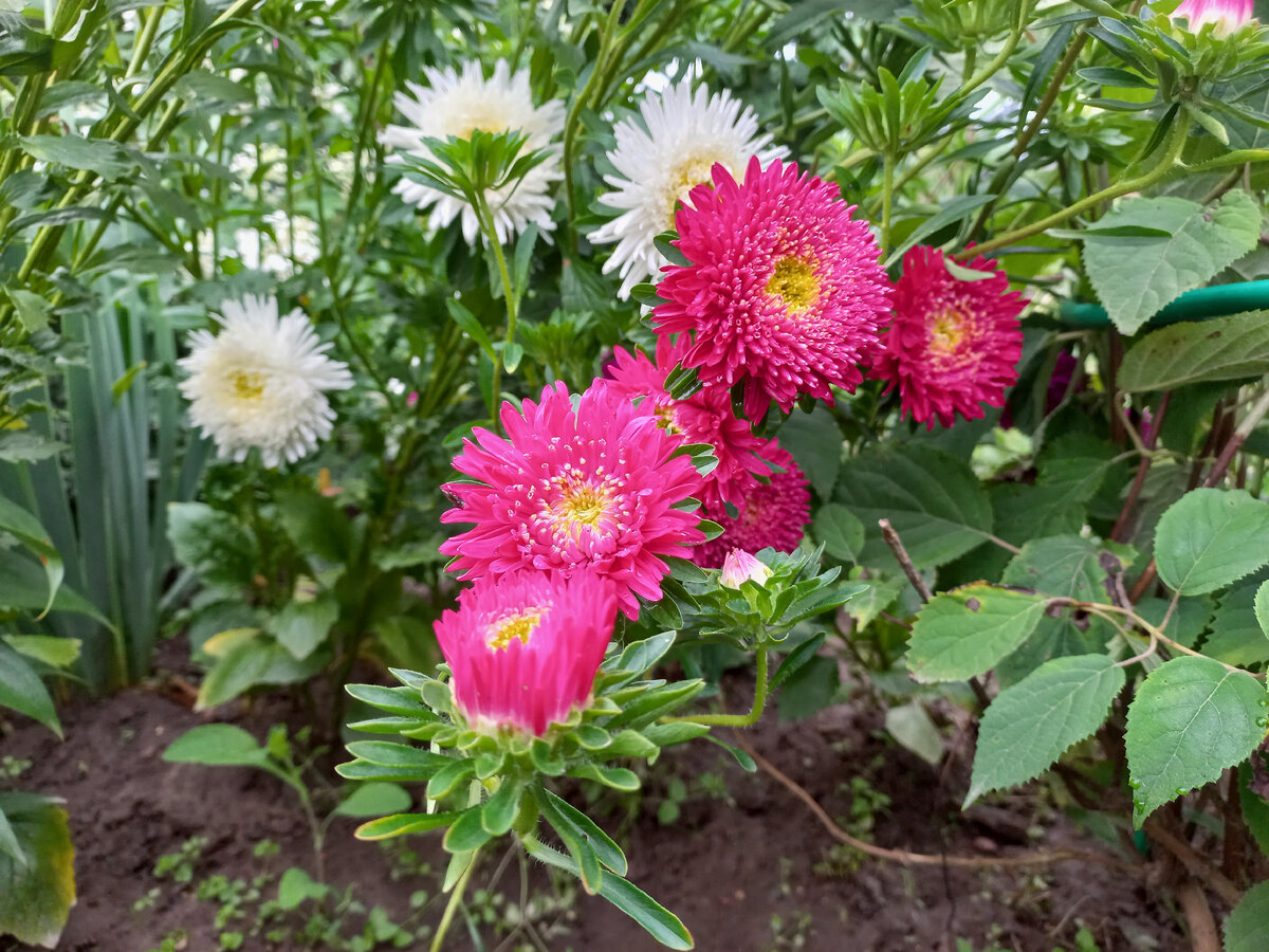 После сильного ливня астры, которые не так давно начали цвести, потеряли вид. Под тяжестью бутонов они прижались к к земле или другим цветам. Это никуда не годиться, ведь цвести астры могут до октября, и если сейчас не исправить ситуацию, то вместо высоких эффектных растений можно получить клубок из переплетённых стеблей и невзрачных бутонов. Срочно принимаюсь за работу. Осторожно выпрямляю кусты, рыхлю землю и окучиваю ими нижнюю часть стеблей. Заодно удаляю сорняки и некоторые листья, которые уже пожелтели из-за непогоды. Такая обработка нужна ещё и для того, чтобы корни лучше дышали, а растения проветривались - это хорошая профилактика заболеваний. Вот как выглядят астры теперь: Я начала работу, а солнце её завершит. Цветы потянуться за ним и окончательно выпрямятся.