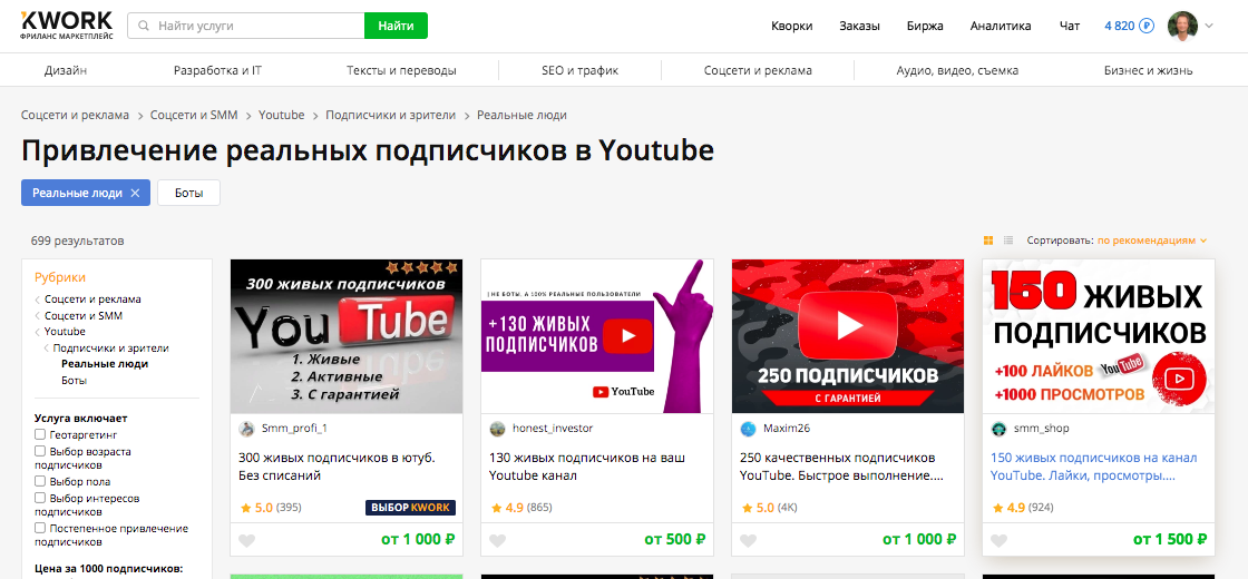 Давайте посмотрим, какие услуги сейчас пользуются спросом. например, заходим на самую крупную русскоязычную биржу фриланса Kwork, которая переполнена услугами по продаже подписчиков, просмотров, лайков. Что предлагают самые "качественные" из них:
