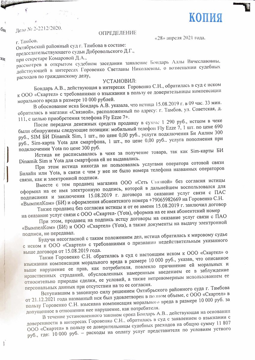 21.12.2020 Октябрьский районный суд города Тамбова по делу № 2-2212/2020 вынес решение об удовлетворении заявленных требований в полном объеме о взыскании компенсации морального вреда. В пункте 20 Постановления Пленума Верховного Суда РФ от 21.01.2016 N 1 "О некоторых вопросах применения законодательства о возмещении издержек, связанных с рассмотрением дела" разъяснено, что при неполном (частичном) удовлетворении имущественных требований, подлежащих оценке, судебные издержки присуждаются истцу пропорционально размеру удовлетворенных судом исковых требований, а ответчику - пропорционально той части исковых требований, в которой истцу отказано (статья 110 АПК РФ). На основании изложенного, Истец обратился с заявлением о взыскании судебных расходов, так как исковые требования были полностью удовлетворены судом. 28.04.2020 определением Октябрьский районный суд города Тамбова отказал Истцу в удовлетворении заявления о возмещении судебных расходов полностью. Вывод судьи об отказе явно ничем
