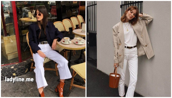 Белый деним на данный момент занимает топовые строчки в модной индустрии. Белые джинсы — это достаточно капризный материал, который нужно уметь правильно комбинировать с другими вещами, чтобы картинка по итогу выглядела целостной и гармоничной. Мы покажем на конкретных примерах, как и с чем лучше всего сочетаются белые джинсы в 2021 году. Любительницам ярких контрастов придется по душе сочетание черного верха с белым низом. Ну, во-первых, эта комбинация всегда была и остается классикой, а во-вторых черный и белый — цвета идеально подходящие друг другу. Трендовую в этом году тельняшку в черно-белую полоску можно носить на постоянной основе с белыми укороченными джинсами и женственной обувью на небольшом каблуке. Заправив объемную тельняшку в джинсы с высокой посадкой, вы получите правильные пропорции фигуры. Белые джинсы клеш с пуговицами вместо молнии чудесным образом сочетаются с черной принтованной блузой. Трикотажная майка молочного цвета, украшенная пуговицами + белые джинсы — еще