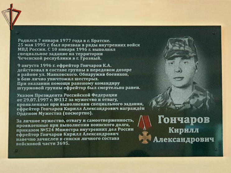 В ангарском полку оперативного назначения Росгвардии почтили память военнослужащего воинской части ефрейтора Кирилла Гончарова, героически погибшего 9 августа 1996 года при исполнении воинского долга на Северном Кавказе. В памятном мероприятии приняли участие военнослужащие полка, представители ветеранских и религиозных организаций, а также родственники геройски погибшего солдата, специально прилетевшие из Новосибирска. «Как и любая мать, в подобной ситуации я испытываю боль от осознания потери своего ребенка, но, когда я вспоминаю о его подвиге, к этому чувству прибавляется чувство истинной гордости, за то, что мой сын вырос настоящим героем», - сказала мама Кирилла, Вера Гончарова. С сентября 1995 года Кирилл принимал участие в операциях по разоружению и ликвидации незаконных вооружённых формирований на территории Чеченской Республики. В августе 1996 года в составе штурмовой группы ефрейтор Гончаров обнаружил скопление чеченских боевиков, доложил командиру и вступил в бой с превосход