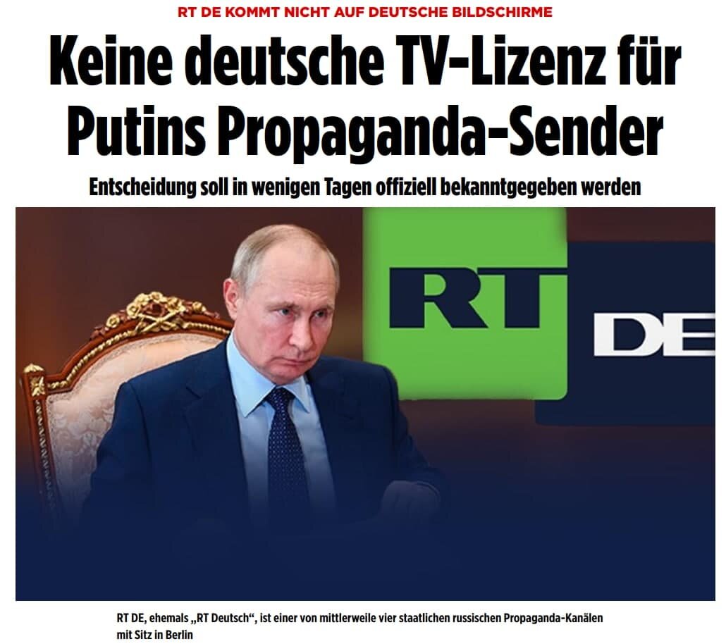 Пока в России Путин от страха уничтожает оппозицию и независимые СМИ, в Германии борются с Кремлевской пропагандой и отказываются продлевать лицензию RT. Давайте на минуточку представим, что Россия лишает аккредитации немецкое DW, что не раз было замечено в откровенных фейках и оголтелой пропаганде? Какой шум поднимет мировое сообщество?