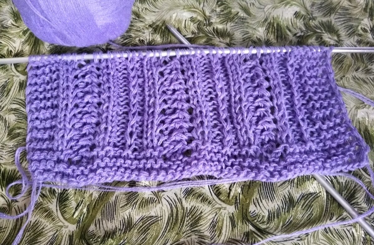 Недавно пересматривала свои запасы узоров. Давно собираюсь рассортировать и систематизировать, но часть схем просто хранится в самой обычной общей тетради с виниловыми обложками. Сегодня приготовила образец узора, сочетающего в себе 2 схемы. Первая часть вяжется просто и справиться с ней по силам даже самым начинающим вязальщицам. На спицы набирается число петель, кратное 12. Плюс петли для симметрии и 2 кромочные. Первый узор вяжется на 5 петель. 1-й ряд: 2 изнаночные петли, 1 петлю снять, как лицевую, нить оставить за работой, 2 изнаночные. 2-й ряд: вяжем 2 лицевые петли, снятую петлю провязываем изнаночной, 2 лицевые. Это раппорт. Далее повторять 1-й и 2-й ряды. Вторая часть рисунка – 7 петель в ширину. 1-й ряд: 2 лицевые петли, 1 петля провязывается лицевой из протяжки, 3 вместе изнаночной, 1 петля лицевая из протяжки, 2 лицевые. 2-й ряд: все петли провязываем изнаночными. Высота раппорта 2 ряда. У меня на образце узоры объединены, раппорт получился в ширину 12 петель. Я его провяз