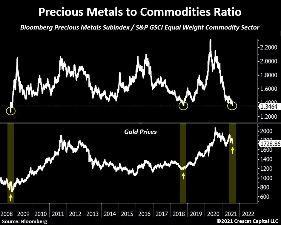 Такой график соотношения золота с сырьевыми товарами опубликовали аналитики из Crescat Capital.