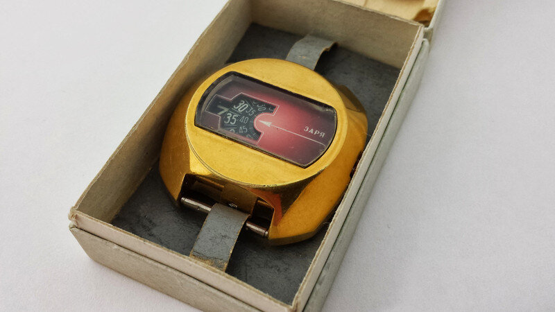 Позолоченные наручные часы с цифровым дисплеем, выпущенные в середине 1970-х годов.