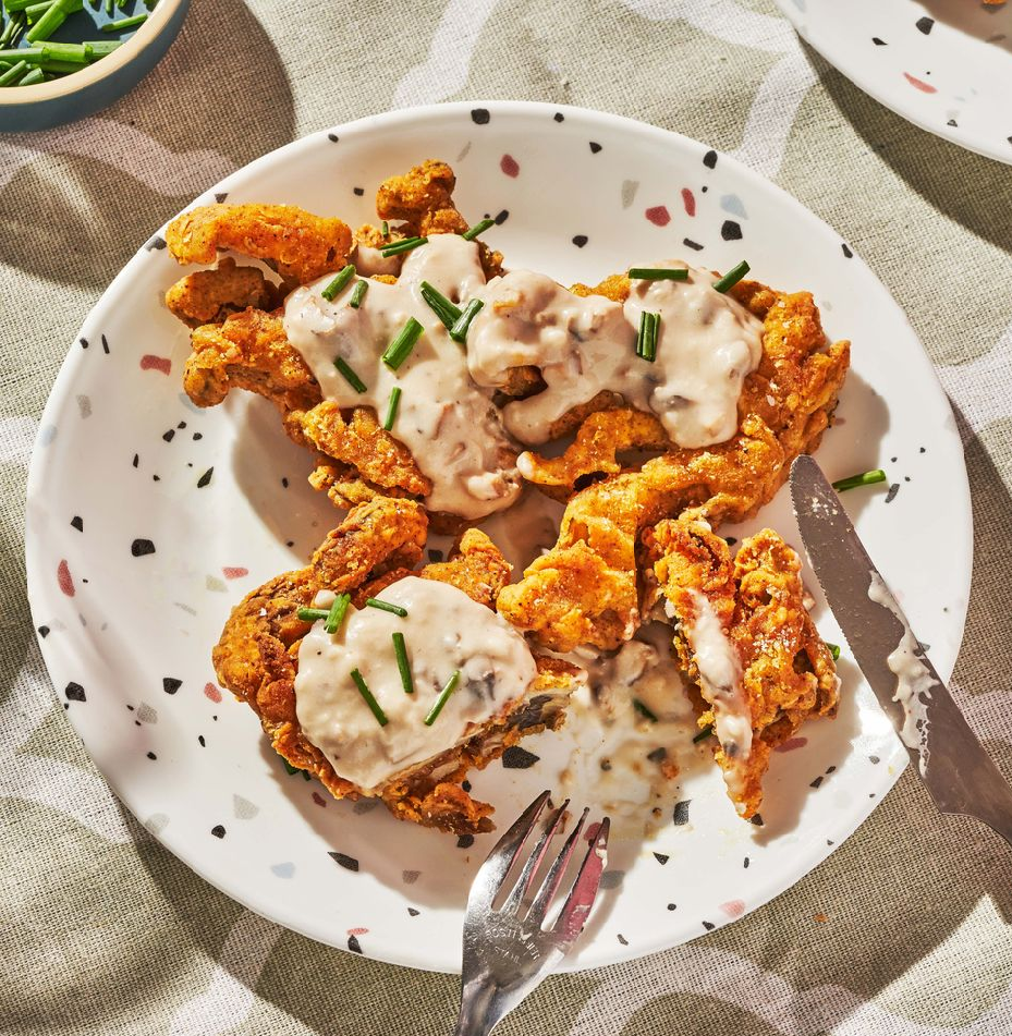 Приготавливаем ингредиенты и погнали! ДЛЯ КУРИЦЫ-ЖАРЕНЫЕ ГРИБЫ Большие пучки вешенок,универсальная мука,кукурузный крахмал, сладкая паприка,чесночный порошок,луковый порошок,куркума,кошерная соль,свежемолотый черный перец,несладкое миндальное молоко,яблочный уксус,растительное масло для жарки,слоеная морская соль. Для Грибного соуса ДЛЯ ГРИБНОЙ ПОДЛИВКИ 2 ст. л. масла, грибы кремини (около 3 крупных), нарезанные мелкими кусочками, зубчик чеснока, измельченный , мука,растительное масло для жарки, несладкое миндальное молоко,мелко нарезанный лук, для гарнира. Приступим к Готовке!