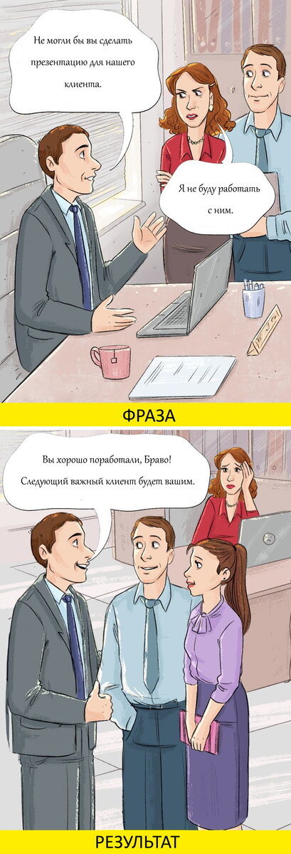 Начальник может дать вам задание, не имеющее ничего общего с вашими обязанностями. Но даже если его просьба неуместна, лучше прямо не отвечать, что это не ваша работа. Такой ответ может расстроить его или заставить поверить в то, что у вас нет командного духа. Это правда, что это позволит избежать получения слишком большого количества работы, но в то же время такое высказывание может помешать развитию вашей карьеры . Это не означает, что вы должны соглашаться со всеми абсурдными задачами своего начальника, но вы должны уметь деликатно сказать «нет».