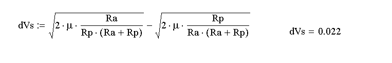 Рассмотрим размеры и расположение орбит МКС и КС Тяньгун. Орбита МКС характеризуется следующими данными: Перигей 409 км Апогей 418 км Наклонение 51,63° Средняя высота орбиты 407,3 км Китайская КС Тяньгун имеет следующие орбитальные параметры Перигей 381,8 км Апогей 394,0 км Наклонение 41,5° Как видим, орбиты отличаются как по геометрическим параметрам, так и по наклонению. Поэтому при перелете от МКС к КС Тяньгун необходимо решить две задачи – перейти на орбиту с геометрическими параметрами Китайской КС, а также совершить поворот исходной плоскости орбиты. Примем для простоты, что обе орбиты круговые, это не внесет большой ошибки в расчеты, т.к. они на самом деле почти круговые: орбита МКС имеет среднюю высоту 407,3 км , а орбита КС Тяньгун – 388 км . Чтобы перейти с одной круговой орбиты на другую круговую, необходимо совершить двух импульсный маневр, который требует следующего значения характеристической скорости (ХС): где μ=398600 км3/сек2 - гравитационная константа Земли, а Ra и R