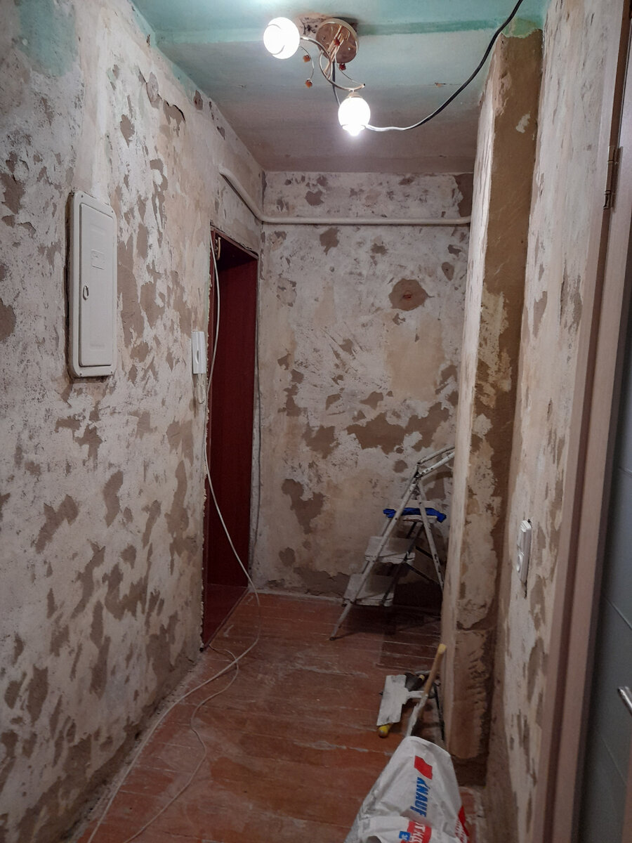 Это обычная 1-комн. квартира в кирпичной четырехэтажной "хрущевке", в ней живет семейная пара с сыном 7 лет. Купили квартиру они около 3-х лет назад в ипотеку, поэтому средств на капитальный ремонт в то время не было. Самостоятельно наклеили обои, постелили линолеум и установили межкомнатные двери. Площадь небольшого коридора около 4 м2. Мне позвонила женщина по рекомендации знакомых и, сказала, что им нужно сделать стены в прихожей под покраску. Договорились, что подъеду посмотрю. Когда я приехала на объект, посмотрела, и спросила: "Почему они решили делать стены именно под покраску", на это она мне ответила, что увидела у знакомой и ей очень понравилось. К тому же не нужно будет постоянно менять обои, да и в интернете посмотрела, что покраска сейчас в тренде. Я посоветовала наклеить стеклообои и уже их покрасить. Объясню почему: во-первых, дом стоит около дороги, к тому же стены кирпичные и для того, чтобы шпаклевка не пошла трещинами, нужно под штукатурку установить армирующуюся с