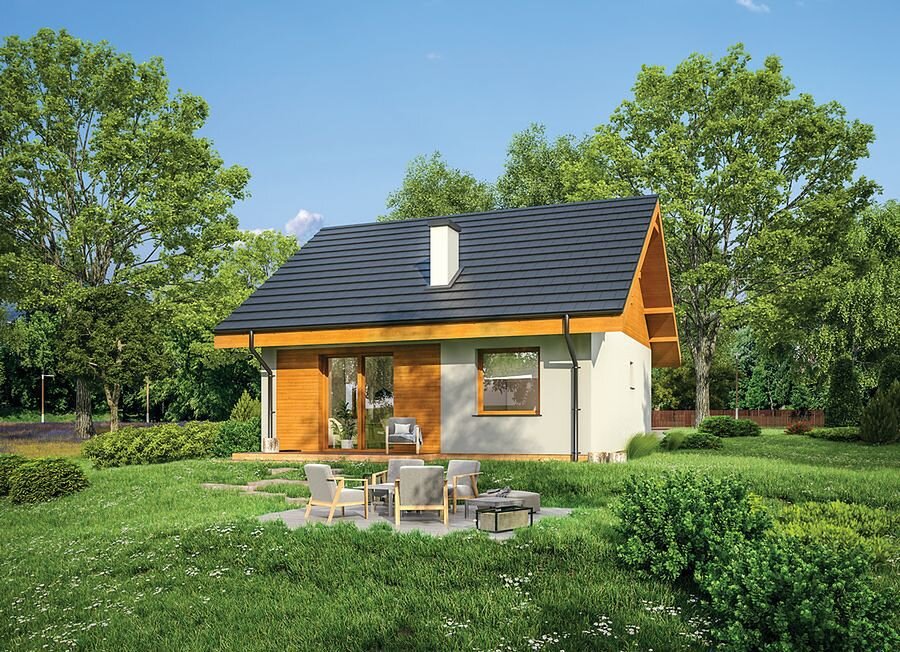 Вашему вниманию представляю проект дома площадью 54.7 м2. Такой дом идеально подойдёт для проживания семейной пары в серьёзном возрасте. Дом можно использовать как гостевой или просто для уединения на дачном участке. Архитектурный стиль современный. Пластика фасадов достигается игрой цвета и фактуры отделочных материалов. Светлая штукатурка всегда беспроигрышно сочетается с деревом. Вставки на фасадах, фронтоны, подкровельные свесы, всё цвета светлого дерева. Панорамное остекление дверей в зоне террасы отвечает требованиям заявленного стиля. Всё очень лаконично, просто и со вкусом. Общая площадь помещений 54.7 м2. 1.прихожая-4.6 2.ванная-4.7 3.спальня-10.5 4.гостиная-23.1 5.кухня-6.0 6.хозпомещение котельная-5.8