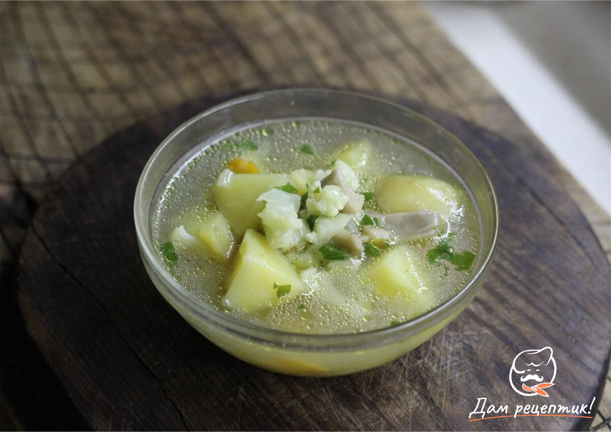 Суп с капустой и свежими вешенками – это диетическое первое блюдо, которое может стать дополнением к обеду. Овощной суп очень витаминный, вкусный и пряный. Такой легкий суп получается довольно наваристым и ароматным, а готовить его довольно легко. Для более пикантного вкуса в такие первые блюда можно добавлять острый перец. Энергетическая ценность на порцию Сложность рецепта: Ингредиенты: Из расчета на 2 литра Рецепт приготовления: Шаг 1 Для начала нужно измельчить кружочками морковку и лук – небольшим кубиком. Пассеровать овощи в кастрюле на масле оливы. Шаг 2 Нарубить вешенки крупными кусочками и обжарить вместе с овощами. Шаг 3 Всыпать картофель, слегка обжарить корнеплоды с вешенками и луком. Влить бульон и варить первое блюдо до мягкости овощей. Шаг 4 Добавить соцветия капусты за десять минут до готовности супа. В конце приготовления всыпать пряности и рубленую петрушку. Шаг 5 Суп с овощами готов! Его можно подавать вместе с разной закусочной выпечкой или гренками. Приятного аппет