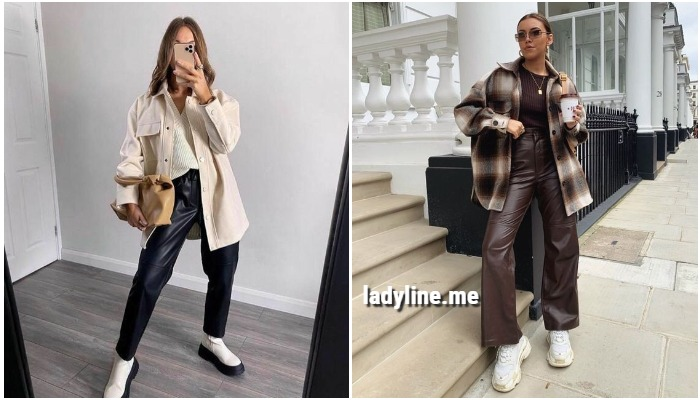 Кожаные штаны — это достаточно капризная и требующая особого внимания вещь. Чтобы образы с этой дерзкой деталью выглядели уместно и гармонично, нужен правильный подход к выбору дополнительных вещей. Сегодня мы расскажем вам, как стильно носить штаны из кожи в этом сезоне. Перед вами 12 идей от самых стильных модниц. Начнем с комфортного и уютного образа, который сочетает в себе: кожаные брюки свободного кроя, трикотажный пуловер в мелкий рубчик, куртку-рубашку и громоздкие черно-белые ботинки Челси. Даже компрометирующие кожаные штаны в облипку можно обыграть правильными акцентами и тогда они не будут выглядеть пошло и вызывающе. Для этого брюки подобной модели уместно комбинировать с оверсайз толстовкой и массивными ботинками на тракторной подошве. Белоснежный свитер с ажурными косами + кожаные брюки свободного кроя + белые массивные кроссовки — еще один удачный сет. Стильные модницы любят примерять в повседневной жизни кожаные брюки с топами, объемными минималистичными пальто и кро
