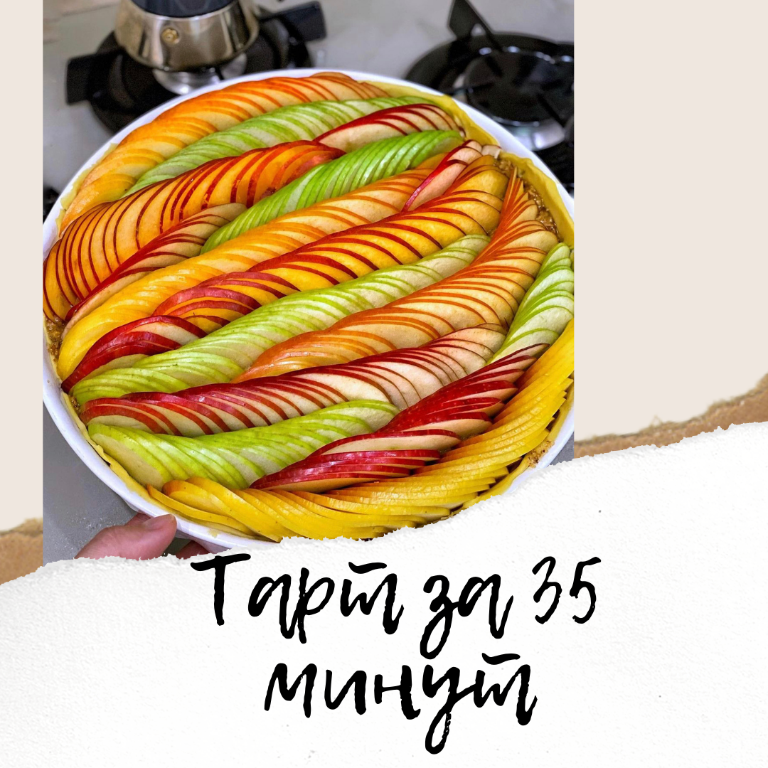 Рецепт на 35 минут 30 из которых выпекается у вас тарт- ну элементарно же. Нам понадобится : ▪️Тесто (я беру покупное и даже не стыдно ) может быть слоенное , может быть для штруделя, песочное ▪️ 6 яблок (берите разного цвета , это чисто для картинки ) ▪️1 нектарин (это может быть и персик или даже груша ) ▪️100 гр сахара (я беру пудру ) ▪️60 гр сливочного масла ▪️100 миндальной муки (или же берём 100 гр миндаля в блендер -вот вам и мука 1) и яйцо Форму застилаем пергаментом и выкладываем тесто тонким слоем , края/лишнее обрезаем. Делаем начинку : смешиваем миндаль ‚ сахар , яйцо и масло (должно быть комнатной температуры)до однородной кашицы и выкладываем ровным слоем внутрь нашего тарта (это начинка ‚ назовём ее так ) Яблоки Грушу Нектарин разрезаем на половинки, вынимаем косточки и нарезаем тоненькими кусочками прям поперёк половинок. Разрезаемые половинки руками растягиваем в стороны , что бы подучилась такая змейка как на фото и выкладываем полоска за полоской на нашу н
