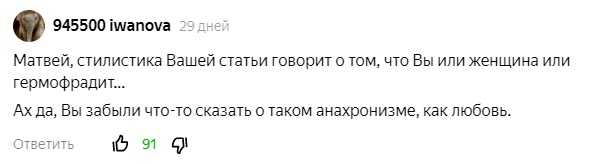 Статья формально адресована мужчинам и написана в панибратской манере. Судя по всему, автор надеялся таким образом прорекламировать свои курсы, на которых каждому страждущему обещает помочь освоить какую-нибудь «востребованную удаленную профессию» и разбогатеть. Но получился откровенно плохой маркетинг. По мужским комментам видно, что статья не зашла даже его аудитории. Количество дизлайков яндекс, увы, не показывает, но каждый из читающих данный текст и считающих хайп на мизандрии неприемлемым может внести в увеличение их количества свою лепту.