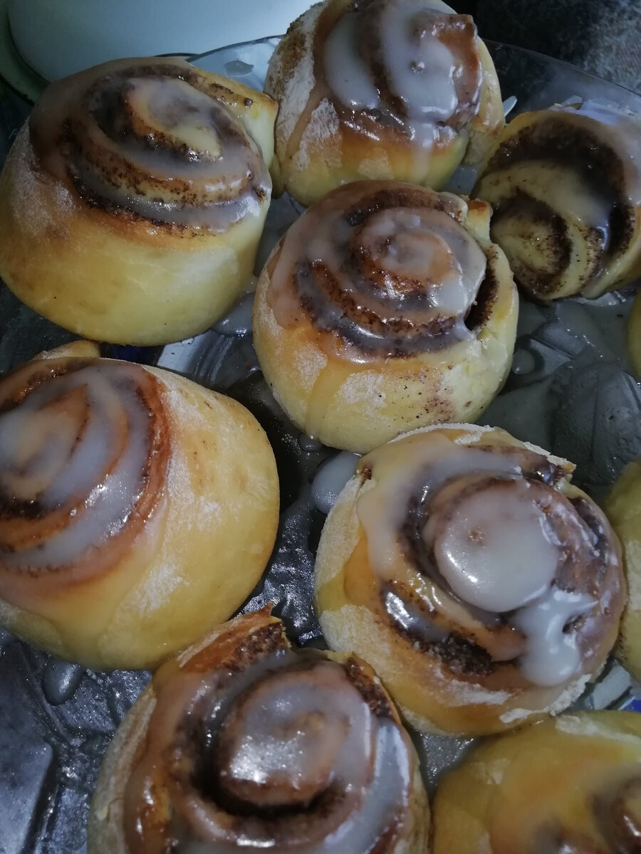 тесто: 250 мл молока 600 г муки 1 столовая ложка дрожжей 2 яйца 80 г. сливочного масла 70 г. сахара 1 чайная ложка соли начинка: сахар, корица, сливочное масло глазурь: 100 гр. сахарной пудры 2 ст. ложки воды 1 ст. ложка растительного масла в тёплое молоко добавить дрожжи и оставить на 10 минут, чтобы они полностью растворились. далее добавить сахар, соль, яйца, растопленное сливочное масло, тщательно перемешать. постепенно добавлять муку, пока тесто не перестанет липнуть к рукам. оставить на 2 часа, чтобы тесто поднялось. раскатать из теста один большой пласт, намазать мягким сливочным маслом. корицу смешать с сахаром и посыпать на тесто однородным слоем. закрутить тесто в рулет и порезать на небольшие части. оставить будущие синнабоны на час, чтобы они ещё поднялись. далее выпекать минут 25 при температуре 180 градусов. глазурь: в сахарную пудру налить кипяток и масло, размешать до однородной массы. после того как достали синнабоны из духовки, полить глазурью.