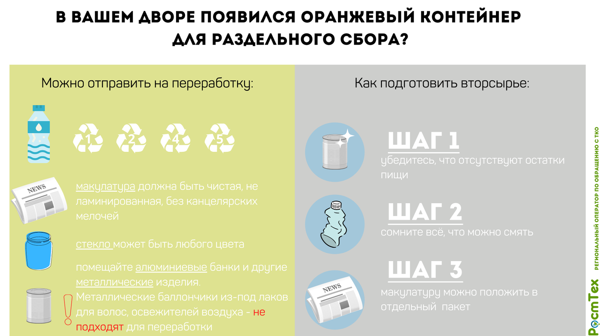 На правобережье Красноярска региональный оператор “РостТех” установил более 300 контейнеров для раздельного сбора. Давайте разберемся, как действовать, если в Вашем дворе появился такой контейнер 🧐 Какое вторсырье можно отправить на переработку? ♻Пластик с маркировками 1, 2, 4, 5 ♻Стекло ♻Металл ♻Макулатуру Как подготовить вторсырье? Если Ваш контейнер для вторичного сырья заполнен, оставьте заявку на вывоз любым удобным способом: через социальные сети регионального оператора или через звонок в call-центр 219-05-05 📞 Если у Вас возникли вопросы связанные с тематикой "обращение с отходами" - Вы всегда можете обратиться за разъяснением к нам, написав в личные сообщения сообщества Подробнее о процессах раздельного сбора, переработки, а также о работе регионального оператора "РостТех", читайте на наших платформах Сайт Одноклассники ВКонтакте
