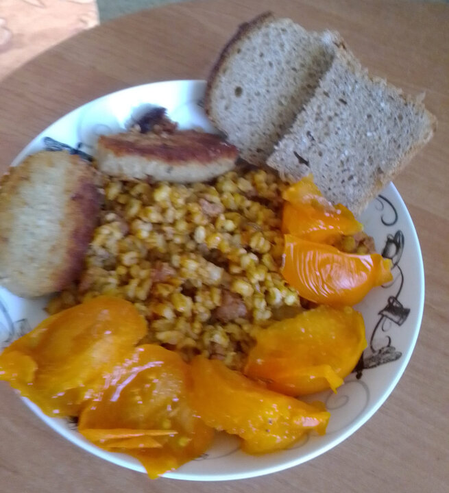 На обед перловка со специями, фаршем индейки, а к ней - рыбные котлеты. Перловку промыть и замочить с вечера - 2,5 стакана воды на 1 стакан крупы. Утром варить перловку в той же воде. Если впитала всё, добавьте примерно две трети стакана воды. Когда закипит, посолить и сделать огонь поменьше. К концу ещё убавьте огонь. Тем временем в глубокой сковороде обжарить слегка фарш с луком, морковью и специями. Специи у меня - куркума, паприка, хмели сунели. Добавить томатной пасты и укропа. По готовности перловки смешать с ней фарш, и оставить настояться. А рыбные котлеты из магазина, поэтому рецепта не предлагаю. Очень понравились. Из кеты. Мягкие, не разваливаются, запах не резкий. И помидорка домашняя. Приятного аппетита! P.S. Порции большие у меня. Аппетит хороший. Но мне надо набрать вес. Больше общения и рецептов - в группе "Жизнь с диабетом" в Facebook! Рецепт на странице в Facebook Автор рецепта - Ольга Посягина