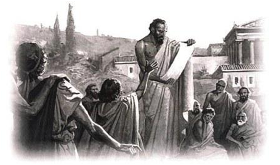 Около 600 — 605 гг. до н.э. в Афинах произошел, как бы это сейчас назвали, стихийный митинг, на котором афинянин по-имени Солон — потомок древнего рода афинских царей, владеющий средним состоянием, поскольку его отец все свое богатство истратил на помощь бедным соплеменникам, произнес речь. Вернее, стихи: слушание стихов в Древней Греции было столь же популярным, как сегодня просмотр телевизионных передач или посещение концертов.