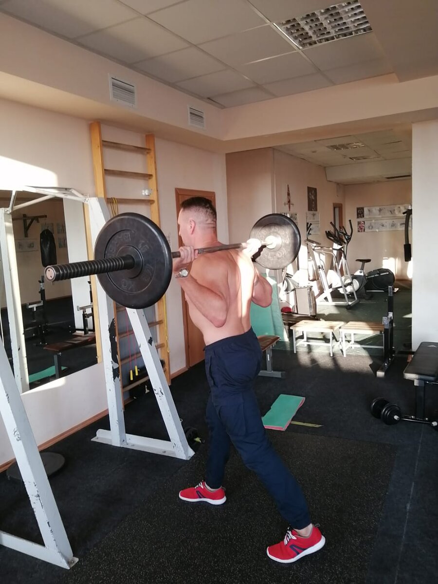 Приветствую всех, сегодня разберём такое упражнение как выпады со штангой- это эффективное упражнение для развития квадрицепсов, также упражнение отлично сжигает калории, что подойдёт для людей, сбрасывающих вес. Упражнение противопоказано людям, которые имеют травмы коленных суставов. Перейдем к технике выполнения упражнения. Подходим к стойке и снимаем с нее штангу, располагая ее на трапециях, также как при классических приседаниях. Отходим на пару шагов и приступаем к выпадам. Делаем вдох и опускаемся, делая шаг правой ногой вперёд сгибая её в колене. Держим равновесие. Центр тяжести держим на опорной ноге(на пятке) и поднимаемся на выдохе, возвращаясь в начальное положение. Выполняем упражнение 10-12 повторений на каждую ногу. При наклоне корпуса тела вперёд в работу включаются ягодичные мышцы. Упражнение можно выполнять и с гантелями, гирями, но об этом в следующей статье. Частые ошибки при выполнении упражнения: 1) Колени уходят за линию носка. Не уводите их, иначе вы можете по