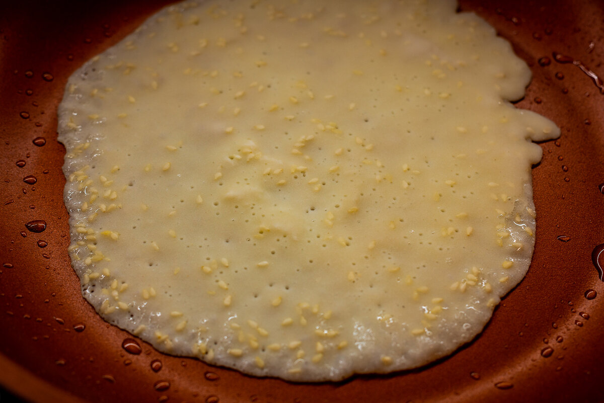 Взбиваем венчиком яйца, добавляем соль, кокосовое молоко, кунжут и теплую воду. Тщательно перемешиваем и вливаем в муку. Даем постоять час-два в теплом месте, разбавляем до текучей консистенции газированной водой и выпекаем блины. Для выпечки можно использовать подсолнечное масло с добавлением ложки кунжутного – это подчеркнет аромат.