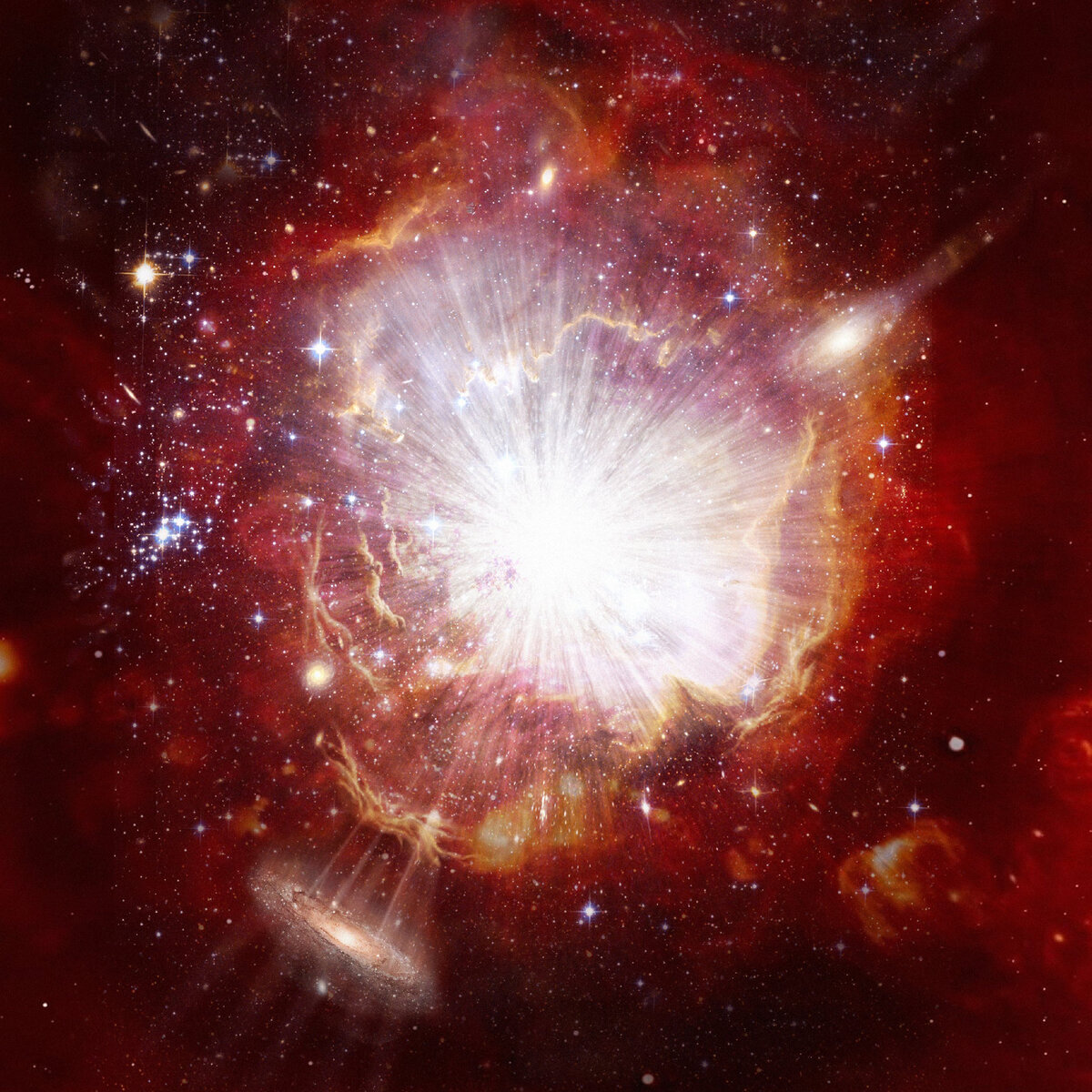 Большой взрыв - гигантский взрыв, который, как пологают учёные, произошёл около 15 млрд. лет назад и привёл к возникновению Вселенной. Материя, энергия, пространство и время, как пологают, возникли в какую-то долю секунды, когда произошёл колоссальный Большой взрыв. При этом возникло вещество, разогретой до чрезвычайно высокой температуры. Вселенная размером с горошину Никто не знает, что вызвало Большой взрыв, так как мы не можем сказать о том, что предшествовало ему. Но в момент до взрыва Вселенная, как предполагают учёные, находилась в особом начальном состоянии, называемом сингулярность, и была величиной с горошину. Охлождение Вселенной С момента возникновения Вселенная начала расширяться и охлождаться. Первыми образовались атомы водорода и гелия (два самых распространённых элемента во Вселенной). На протяжении следующего миллиарда лет сформировались первые звезды и галактики, вещество которых растянулось благодаря силам гравитации. И наконец, начали образовываться планеты. Ра
