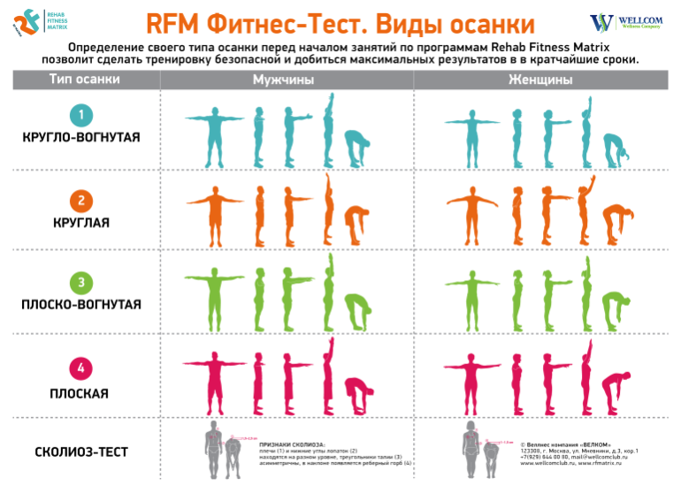 3) видеопрограммы уроков Balance, Flex и Core, которые позволяют заниматься в одной группе клиентам с 4-мя самыми распространенными типами осанок: округло-вогнутой, круглой, плоской и плоско-вогнутой