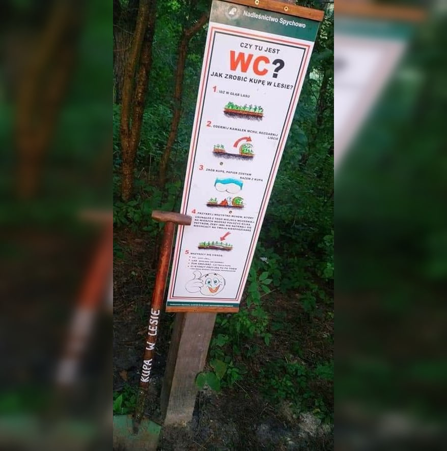 Понятно, что во время экономических и, тем более, ковидных ужасностей думать об экологии можно если где-то что-то прорвало, и надо это что-то срочно убирать. А пока стоит отложить озоновые айсберги с пластиком Греты до лучших времен. Но у поляков всегда был своеобразный юмор с хуторской хитростью. Местные польские власти начали учить людей, как правильно, гм!, какать в лесу. Смеяться не стоит. Результат стоил того. Буквально 3 недели назад странные стенды с инструкцией по грамотной дефекации в немалом количестве были замечены на северо-востоке страны - это лесничество Спыхово. На стендах честно указаны выходные типографские данные: знаки изготовлены по заказу Государственного агентства лесного хозяйства. Причем у каждого шеста с табличкой стоит лопата. На табличке дословно: Так тут есть туалет? Как сделать кучу в лесу? А на лопате вырезано: Куча в лесу. Само руководство в пяти картинках рекомендует для начала пройти подальше вглубь леса от дороги (чтобы никого не огорчить своей дефек