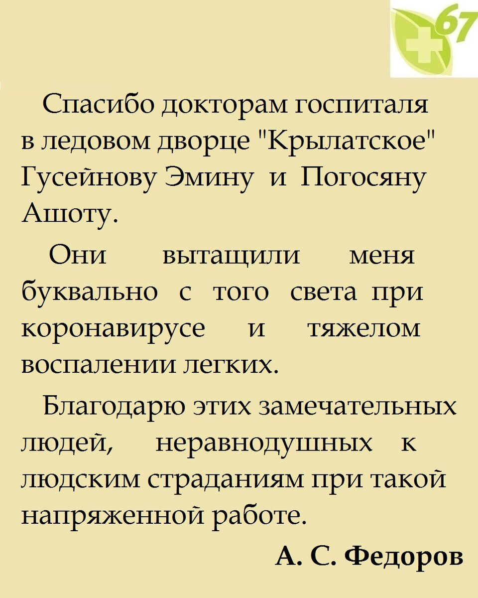 Мы продолжаем получать благодарности от пациентов госпиталя в Крылатском и их родных. Большое Вам спасибо за тёплые слова! Берегите себя - соблюдайте меры профилактики и не откладывайте прохождение вакцинации. Узнать подробности о вакцинации от COVID-19 и записаться на прививку можно на сайте MOS.ru по ссылке: https://www.mos.ru/city/projects/covid-19/privivka/ Будьте здоровы! #Москва #Крылатское #госпиталь #врачи #медсестры #больница #гкб67 #COVID #коронавирус #спасибо