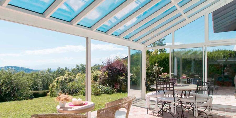 Раздвижные конструкции в пол можно устанавливать в доме при выходе на улицу, либо остеклять ими пространство самой террасы. Полностью наружное остекление можно дополнить светопрозрачной крышей. Если над верандой уже есть глухая кровля, в нее можно встроить потолочные окна. Конструкции вертикального панорамного остекления могут быть рамными или безрамными. Это базовая характеристика, от которой отстраиваются все остальные возможности при создании остекления для террасы или веранды.