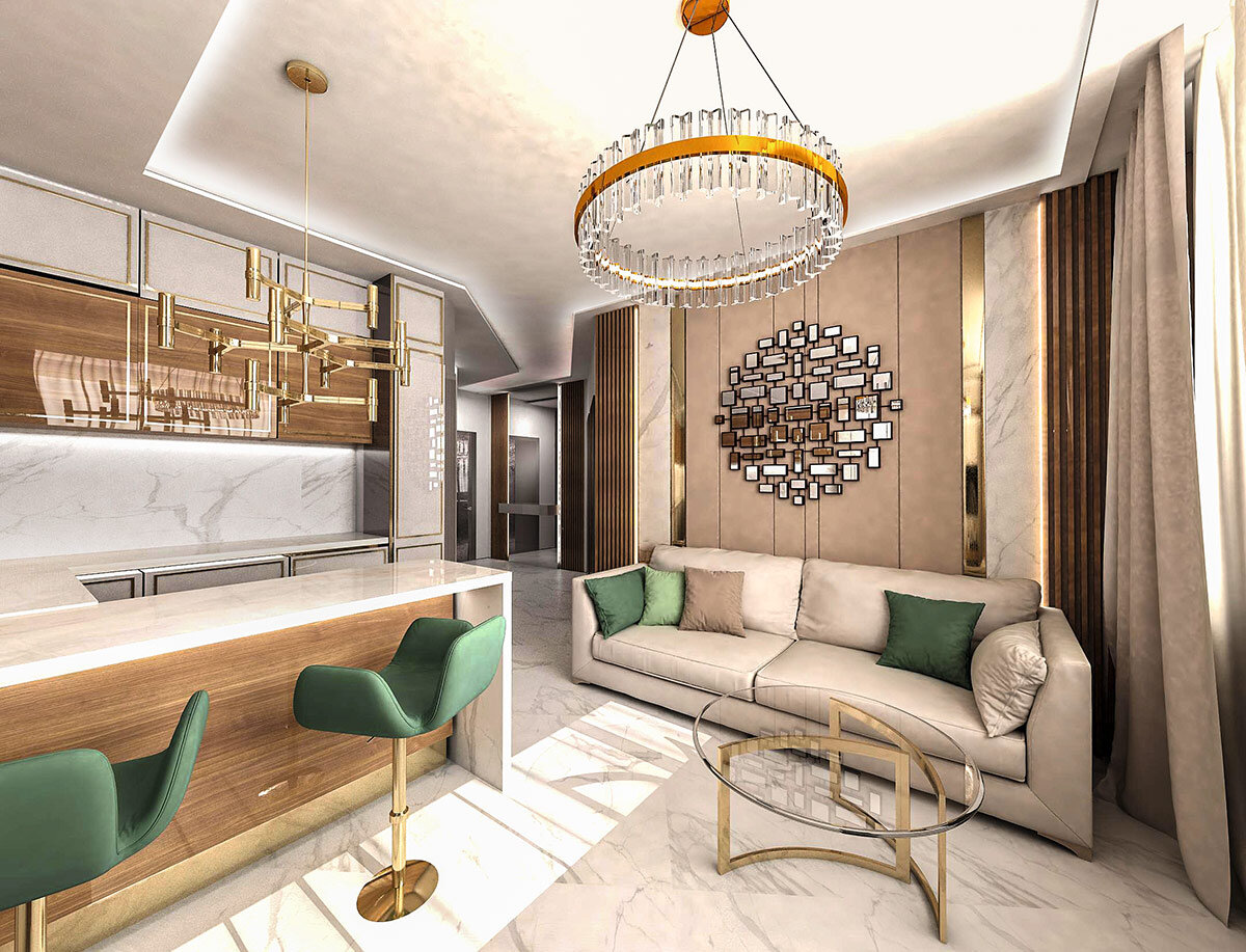 Основная проблема при обустройстве компактных квартир — грамотная планировка. В данном проекте на сравнительно небольшой площади удалось организовать гостиную и зону кухни с барной стойкой, спальню, гардеробную и просторный санузел. Проектирование: дизайн-студия Марии Закалаты, г. Москва Автор проекта: архитектор Мария Закалата Современный интерьер для молодой девушки aпостроен на цветовом и фактурном контрасте: глянцевые фасады мебели и керамогранит придают ему изысканность, покрытие стен с эффектом шелка вызывает неповторимые тактильные ощущения, а скрытая подсветка добавляет пространству изящество. Общая площадь — 47,0 м² Гостиная-кухня — 24,3 м²