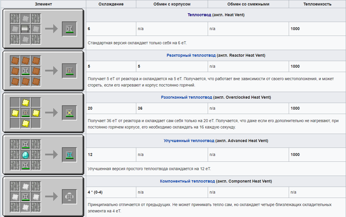 На индустиральных серверах существуют Ядерные реакторы, но не все игроки желают ими пользоваться или даже боятся их взрыва, сегодня я развею страх перед ядерным топливом, показав сбалансированные сборки реакторов которые не требуют обслуживания и полностью безопасны Теплоотводы являются нагреваемыми элементами, способные каждый тик уменьшать свою теплоту на определенную величину вплоть до нуля, так же каждый тик он охлаждает все соседние нагреваемые элементы на 4 еТ. Данные компоненты в первую очередь служат для балансировки тепла между компонентами. Отличаются от предыдущих тем, что не всегда передают максимальное возможное для них количество тепла. Они балансируют тепло между собой, корпусом и соседними компонентами так, чтобы относительный нагрев их всех был равен. При этом сами не уменьшают общее количество тепла. Схемы реакторов на уране. Реактор на 20 EU/t Реактор на 35 EU/t Реактор на 60 EU/t Реактор на 100 EU/t Реактор на 120 EU/t Реактор на 170 EU/t Реактор на 230 EU/t Реа