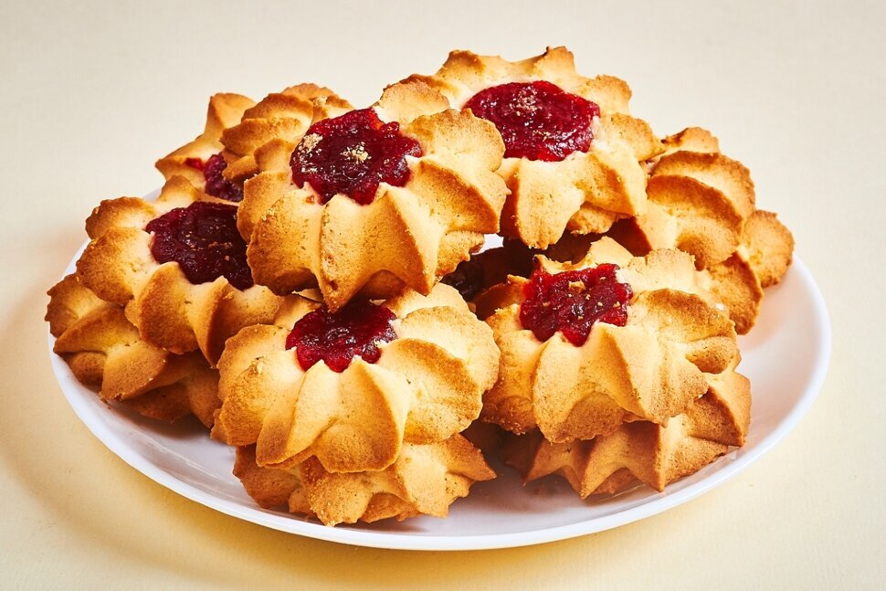 Ингредиенты Мука - 550 г (около 4-х стаканов); Пудра сахарная - 150 г Масло сливочное - 350 г Белки яиц - 1 шт. Пряности по вкусу (ваниль, шафран ...) Повидло или джем фруктовые Сначала разотрите сливочное масло (или сливочный маргарин для выпечки) с сахарной пудрой. Затем добавьте белок крупного яйца или два белка от мелких яиц. Белок для этого печенья взбивать не нужно. Тщательно перемешайте. Добавьте муку с пряностями (обычно это ванилин, корица или шафран). Перемешайте и замесите тесто. Песочное тесто не любит лишнего тепла, поэтому лучше перемешивайте и вымешивайте при помощи лопаточки или кухонной техники. Тесто получится мягчайшее и при этом эластичное. Если у вас есть кондитерский мешок с необходимой насадкой, то отсадите порции теста в виде "цветочков" на противень, смазанный маслом или укрытый пекарской бумагой. Если у вас, как и у меня этого девайса нет, то нарежьте тесто на кусочки и сначала скатайте из них шарики размером с грецкий орех. Затем приплюсните их в лепешки, реб