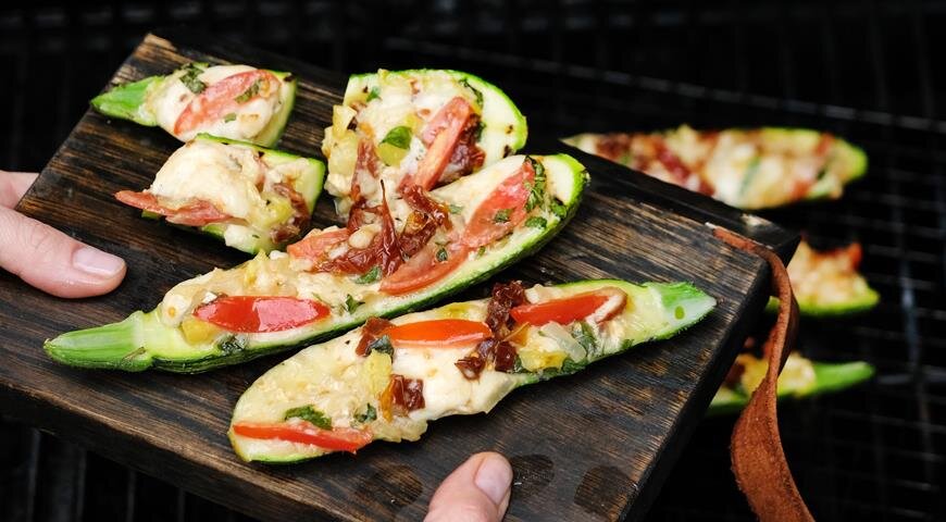 Фаршированные сыром кабачки Немного фантазии, и вот уже простые кабачки превращаются в изящные "лодочки" с молодым сыром и помидорками черри. Кабачки можно заменить на цуккини. ИНГРЕДИЕНТЫ ПОШАГОВЫЙ РЕЦЕПТ ПРИГОТОВЛЕНИЯ Шаг 1 Разрежьте кабачки вдоль пополам, ложкой вычерпайте часть мякоти. Мякоть порубите, кабачки чуть надсеките крест-накрест, смажьте маслом, посолите. Обжарьте на решетке над углями с обеих сторон, 4 мин. Или на раскалённой сковороде-гриль до образования характерных для неё подпалин. Шаг 2 Лук очистите и нарежьте средними кусочками. Положите на двойной слой фольги, добавьте мякоть кабачков, поднимите края, полейте маслом из баночки с вялеными помидорами, посолите, поперчите, закройте края и положите получившийся «конверт» на решетку над углями. Жарьте, перевернув 3–4 раза, 5–7 мин. Или готовьте в духовке при 200 °С, 15 мин. Шаг 3 Измельчите чеснок. Тонкими полосками нарежьте вяленые помидоры. Черри разрежьте пополам. Тонко нарежьте листья базилика, оставив несколько ме