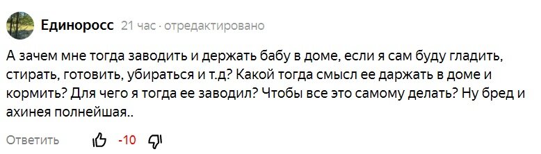 Мне всегда интересно послушать и почитать о том, что думают другие люди. Наверное, именно поэтому и веду блог, поднимаю темы, которые лично мне кажутся интересными. Например, недавно стало любопытно, как разные семьи распределяют обязанности между собой. Я никого не осуждаю и считаю, что каждая пара сама должна решать, кто и какие дела будет выполнять. Главное, чтобы это и мужа, и жену устраивало. Впрочем, лично я для себя давно решила, какой формат отношения меня бы точно не устроил. Стало интересно, есть ли те, кто думает так же. Вчера подняла такую "острую" тему по поводу того, что женщина НЕ должна сама готовить, прибираться, стирать и гладить одежду, а то и заниматься воспитанием детей. Мужчина должен принимать участие в этих делах, даже если он работает. Можно делать обязанность поровну, в том случае, когда женщина тоже трудоустроена. Если же она домохозяйка, то её хоть какая-нибудь помощь не помешает. Не все мужчины со мной согласились... Нашлось немало тех, кто считает, что