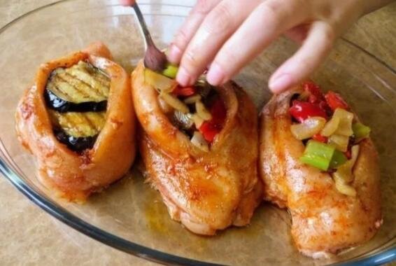 Делаем в грудке надрезы, кладём в каждый кусочек сыра и помидор, смазываем оливковым маслом и посыпаем любимыми специями. Формируем лодочку из пергамента, я с 2-х сторон закрепила зубочистками - идеально! Выкладываем курицу в лодочку. Я ещё обложила ее овощами в оливковом масле с солью. Готово. В духовку на 180 градусов 30-40 минут.