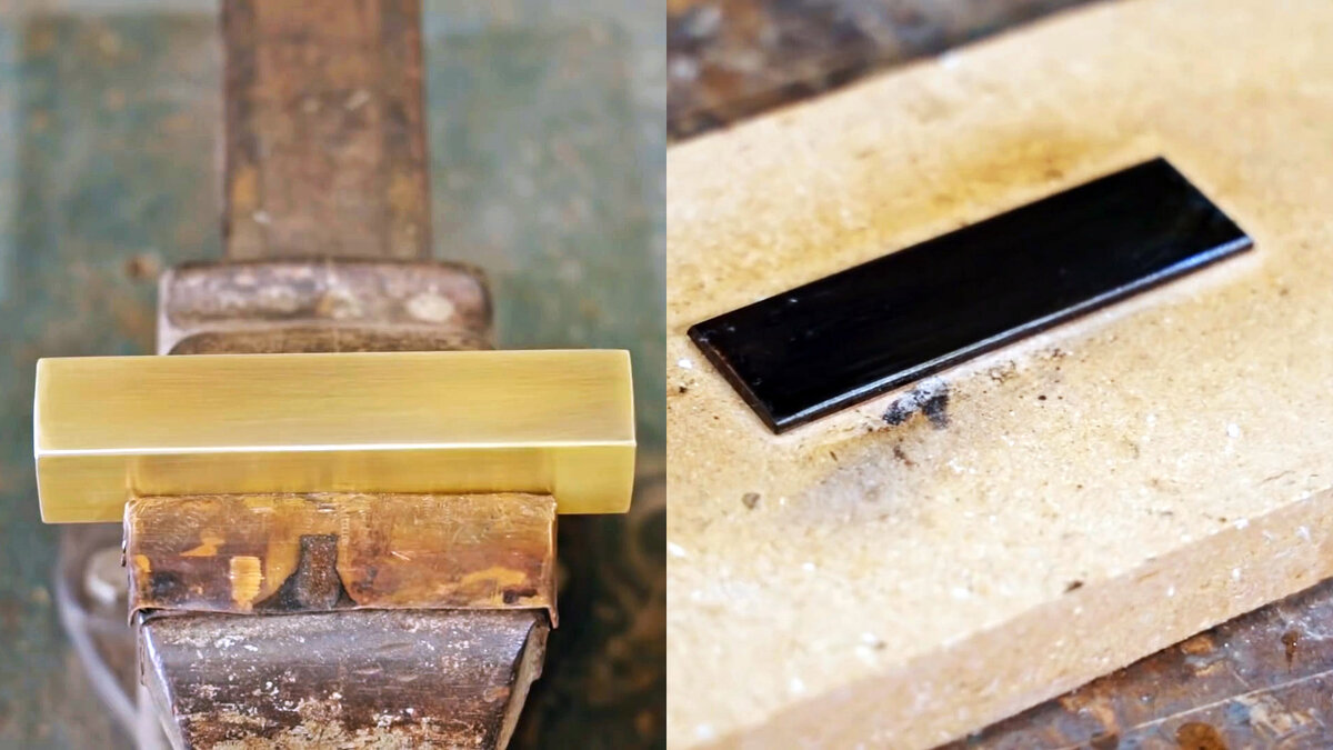 простейшие варианты покрытия стали, которые можно проделать своими руками и в домашних условиях. Нанесение латунного покрытия Стальную заготовку нужно отшлифовать до блеска. Финальная обработка выполняется наждачкой как минимум Р180. Обезжирить заготовку. После чего нагреваем газовой горелкой до соломенного цвета побежалости, и зачищается латунной щеткой по металлу. Цвета побежалости – это радужные разводы соломенного, золотистого, пурпурного, фиолетового и других цветов и оттенков на чистой поверхности нагретого металла, возникающие в результате появления тонкого слоя оксидов. В результате обработанная поверхность станет выглядеть как латунь. Обычное темное чернение льняным маслом Заготовка шлифуется и обезжиривает