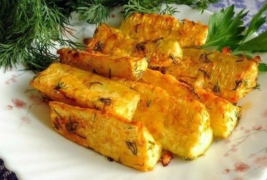 Разрежь кабачки на 8–12 частей. У тебя должны получиться брусочки длиной 5–7 см. Посоли, добавь специи, тертый сыр и растительное масло. Выпекай в духовке на решетке при температуре 200 градусов до золотистой корочки. Подавай со сметаной.