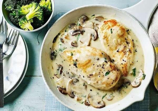 Курицу обжарить на сковороде с двух сторон до румяной корочки, сильном огне. Запечатаем, чтоб она осталась сочной. Затем выложить на тарелку и обжарить в этой сковородке на сливочном масле мелко нарезанные грибы, пока не испарится жидкость. Следом обжарить с грибами лук до мягкости. Залить сливками, добавить плавленый сыр, посолить, поперчить, приправить. Всё тщательно перемешать и убрать в сторонку. Картошку нарезать на тонкие кружочки и выложить на дно формы для выпечки. Поверх картошки полить соус и распределить равномерно. Затем сверху укладываем курочку. Накрываем фольгой и в духовку на минут 40-50 при 180-200 градусов. О