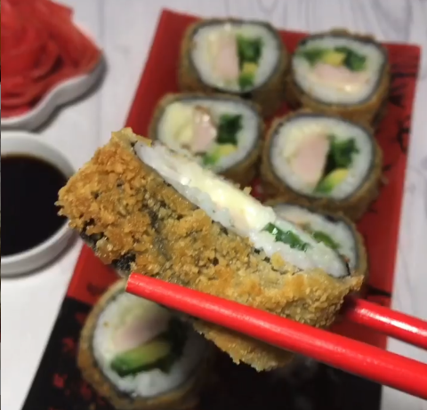 Рис кладём ровным слоем на лист нори,затем начинку. Сворачиваем ролл,легко это делать с помощью циновки. Края нори смочить водой,чтоб скрепить ролл. Далее окунаем ролл в кляре(яйцо+соль) и панировочных сухарях.